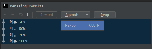 반면에 Fixup은 메뉴 30% ~ 메뉴 100%까지의 커밋 메시지를 삭제하고 '메뉴 기능 구현'이라는 새로운 커밋 메시지 1개만 만들어낸다.