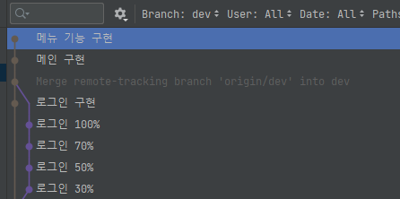 Squash는 메뉴 30% ~ 메뉴 100%까지의 커밋 메시지를 그대로 보존한 채 '메뉴 기능 구현' 이라는 새로운 커밋을 만들어낸다.